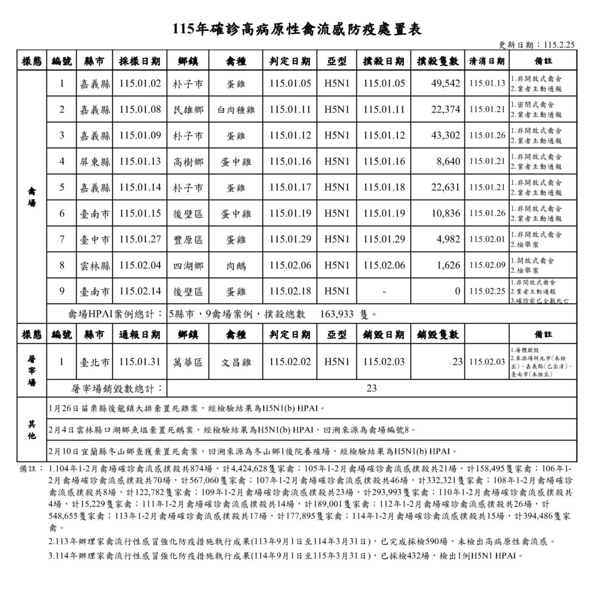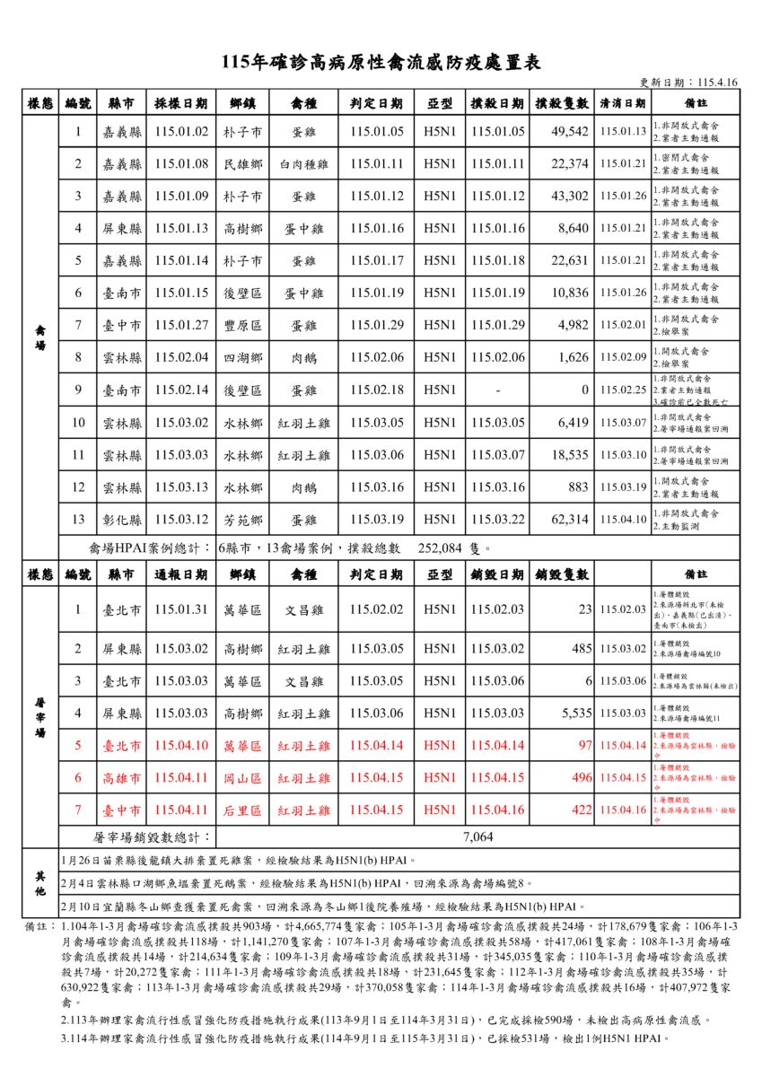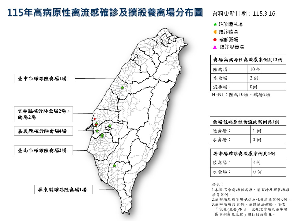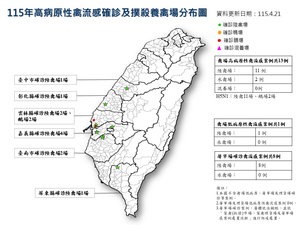 115年高病原性禽流感確診及撲殺養禽場分布圖
