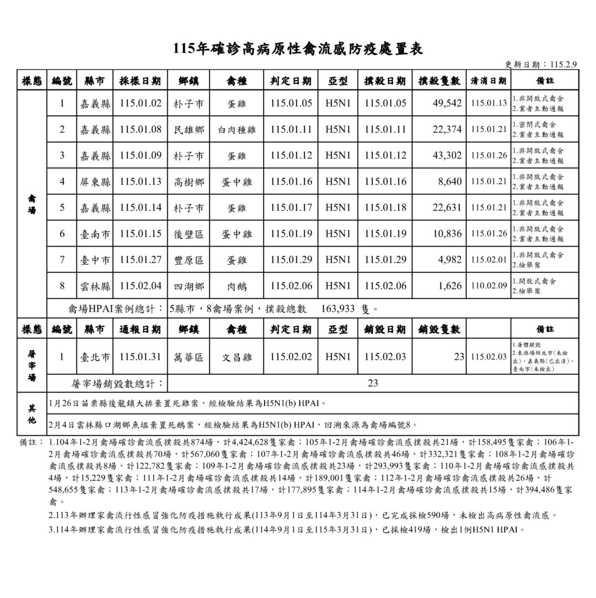 115年確診高病原性禽流感防疫處置表