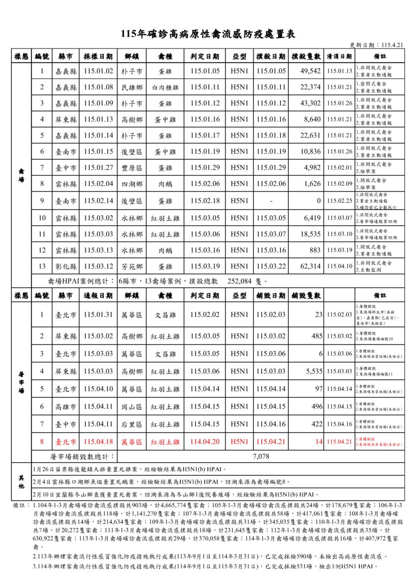 彰化芳苑蛋雞場確診H5N1高原病性禽流感,請業者落實各項生物安全工作