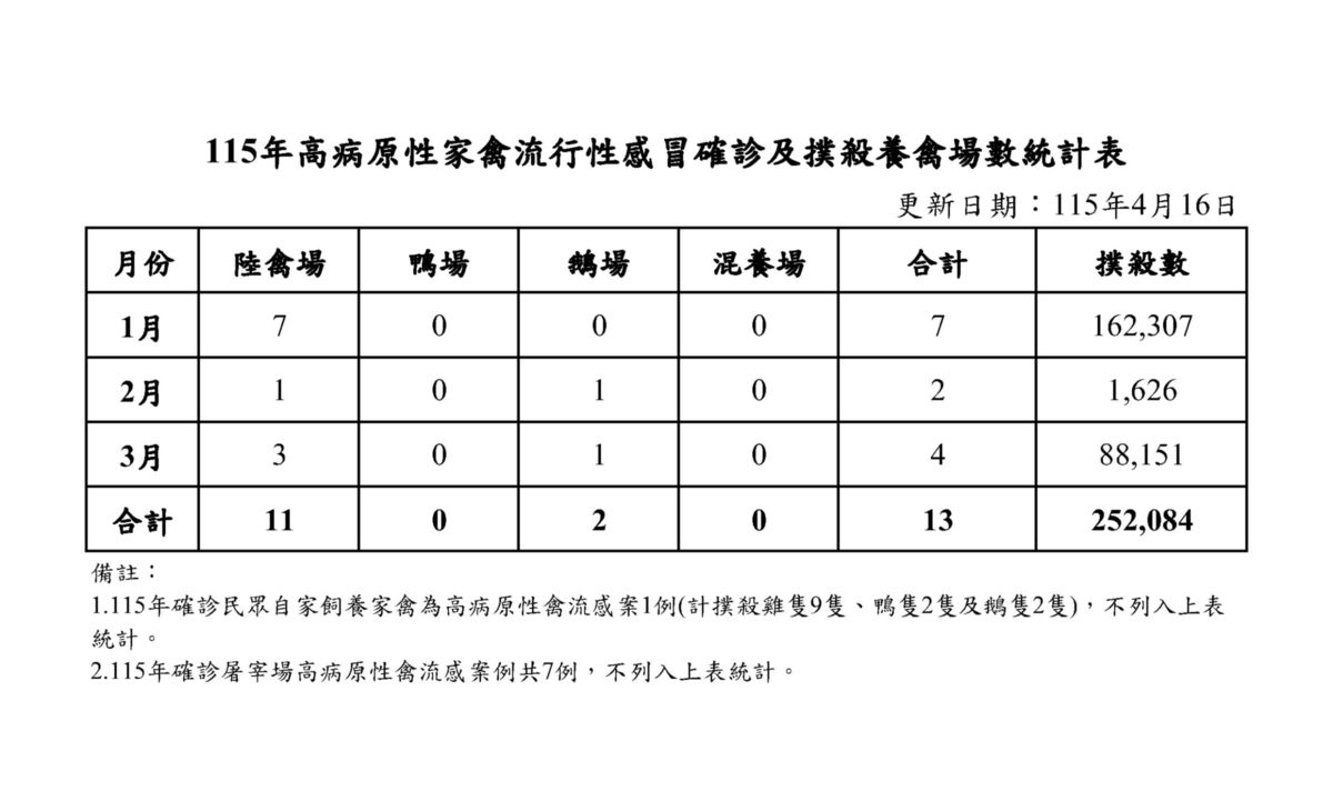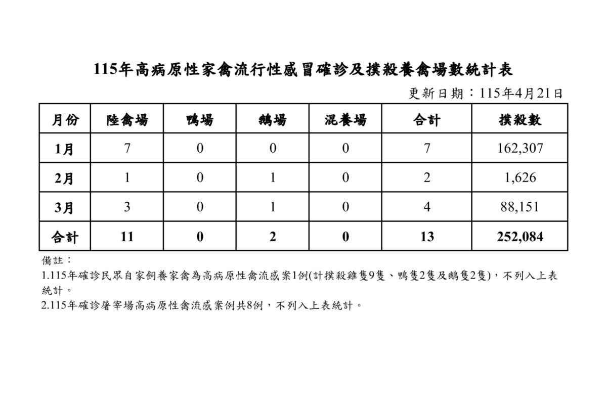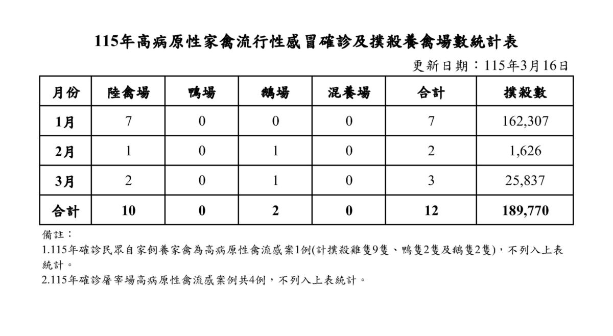 115年高病原性家禽流行性感冒確診及撲殺養禽場數統計表(按月)