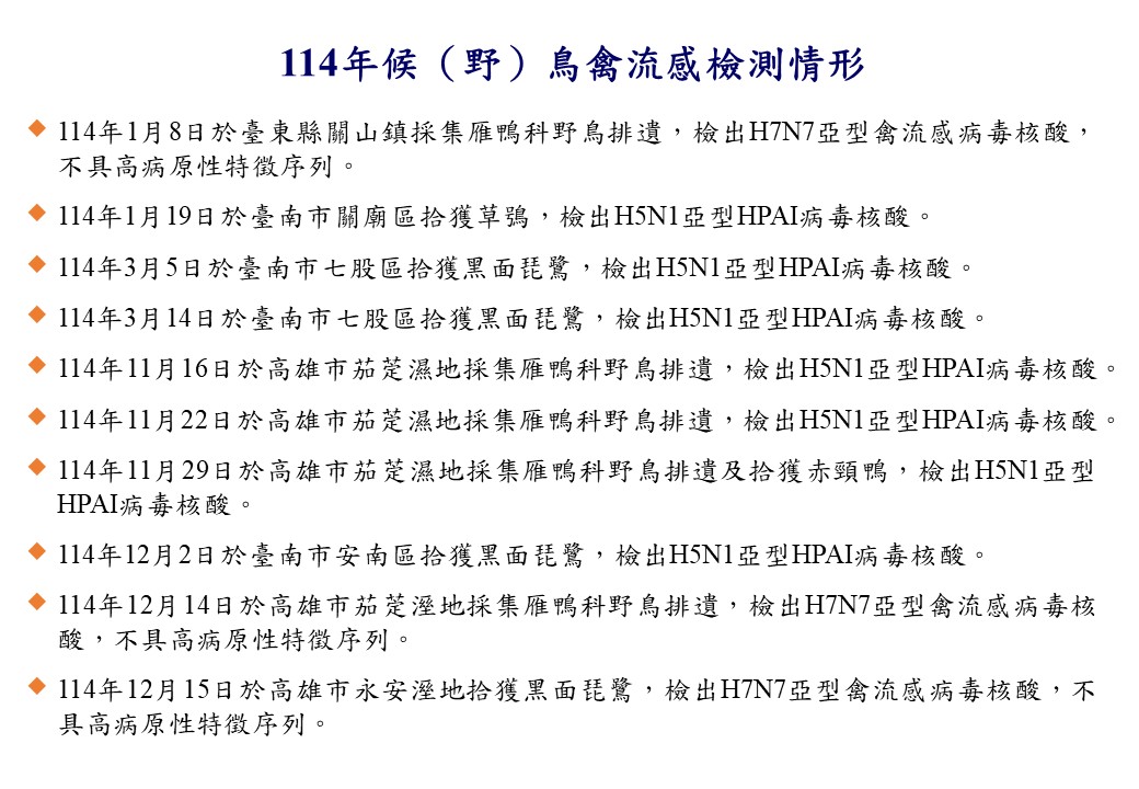 114年候(野)鳥H5、H7亞型禽流感監測結果